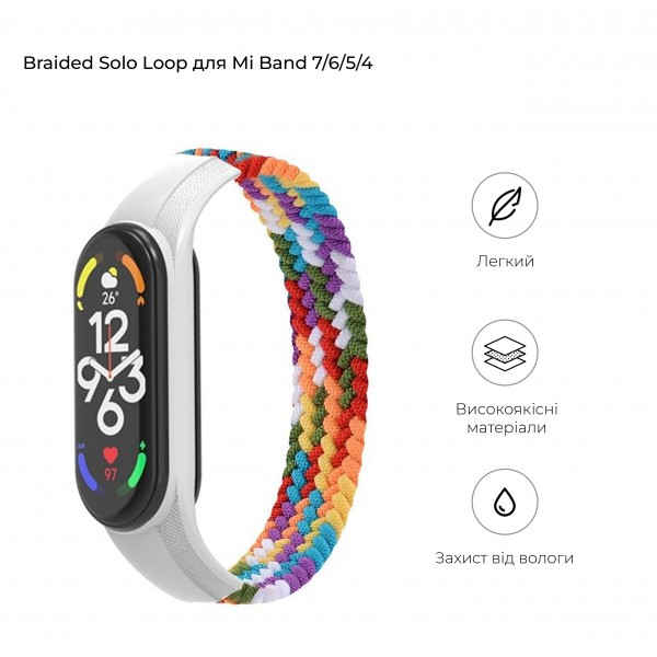 Braided Solo Loop для Xiaomi Mi Band 7/6/5/4 изготовлен из прочного и практичного материала. Его яркая расцветка превратит гаджет в оригинальный аксессуар, который станет отличным дополнением модного образа